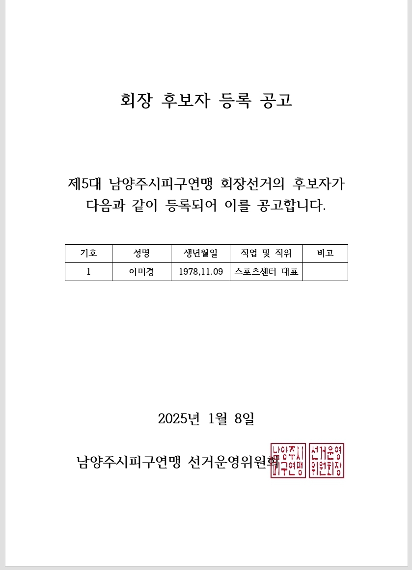 피구 공고문_남양주시피구연맹_회장 후보자등록 공고 작성자 김시덕 등록일자 2025년 1월 13일 9시 42분 31초 조회 376 공고문_남양주시피구연맹_회장 후보자등록 공고.jpg [ Size : 98.87KB, Down : 142 ] 미리보기 다운로드 목록보기