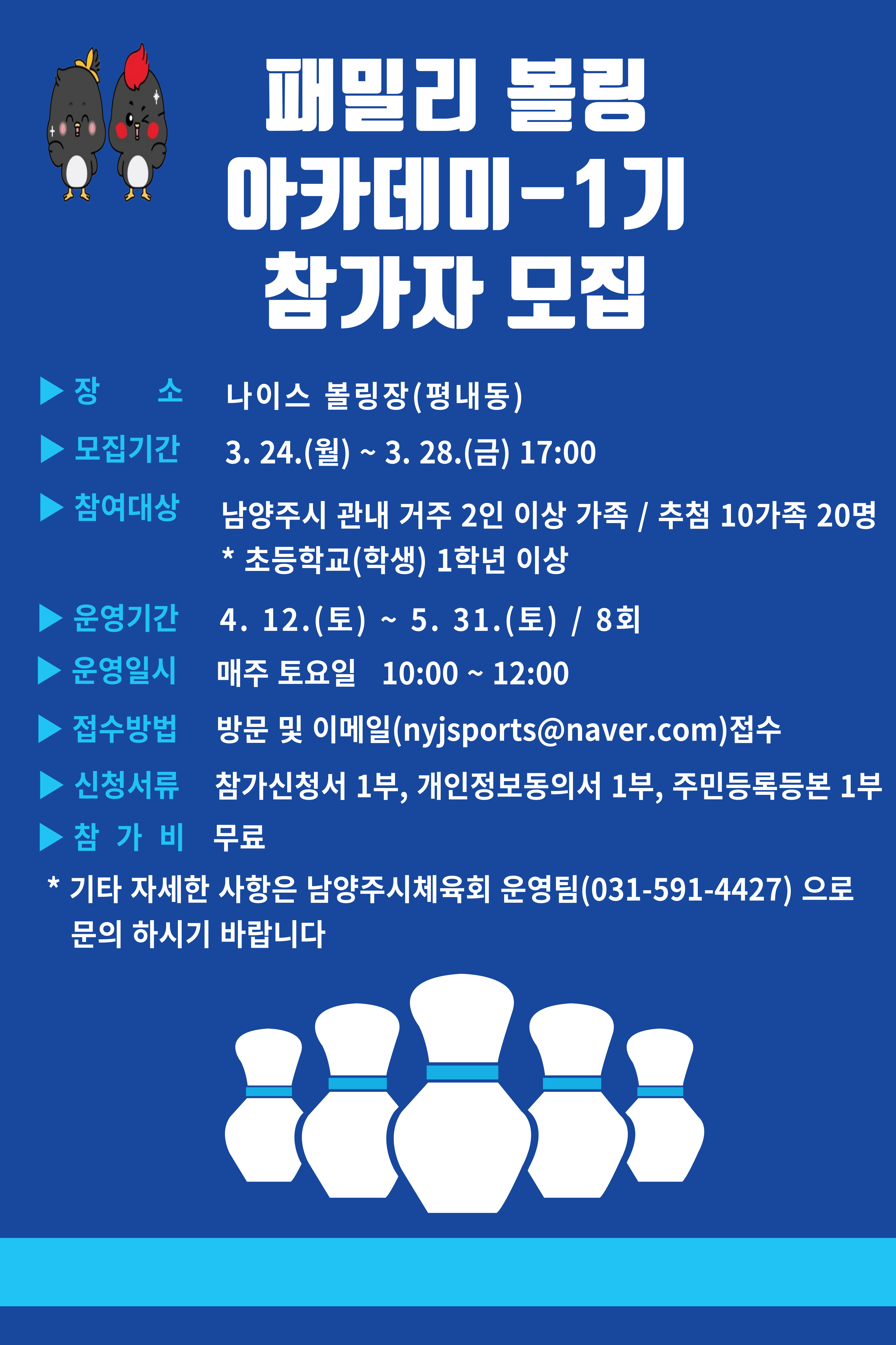 2025년 패밀리볼링 아카데미 참가자 모집 작성자 남양주시체육회 등록일자 2025년 3월 13일 10시 41분 1초 조회 628 2025년 패밀리 볼링 아카데미 신청서류(양식).hwp [ Size : 73KB, Down : 692 ] 다운로드 2025년 패밀리 볼링 아카데미 참가자 모집 공고.jpg [ Size : 1.74MB, Down : 261 ] 미리보기 다운로드 목록보기