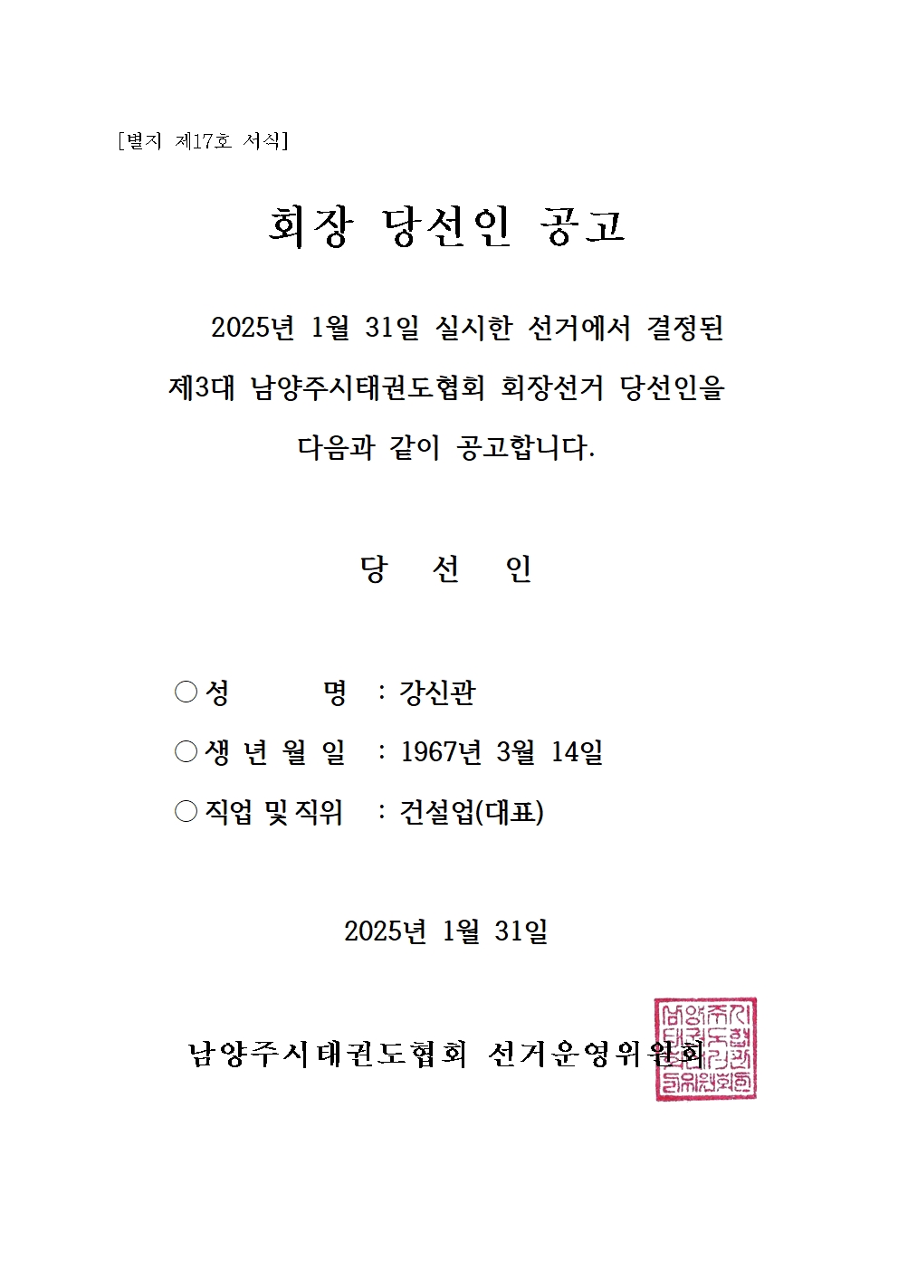 태권도 제3대 남양주시태권도협회 회장 당선인 공고 작성자 김석산 등록일자 2025년 2월 1일 17시 36분 45초 조회 319 회장 당선인 공고001.jpg [ Size : 216.65KB, Down : 127 ] 미리보기 다운로드 목록보기