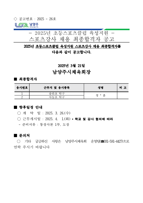 2025년 초등스포츠클럽 스포츠강사 채용 최종합격자 공고 작성자 남양주시체육회 등록일자 2025년 3월 21일 16시 22분 51초 조회 304 초등스포츠클럽 스포츠강사 채용 최종합격자 공고.png [ Size : 68.33KB, Down : 265 ] 미리보기 다운로드 목록보기
