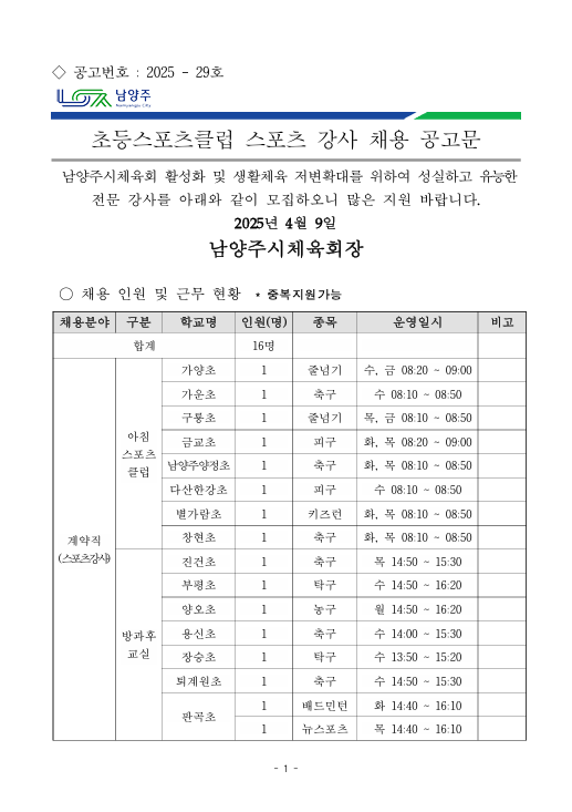 2025년 초등스포츠클럽 스포츠강사 채용(2차) 공고 작성자 남양주시체육회 등록일자 2025년 4월 9일 16시 59분 58초 조회 341 2025년 초등스포츠클럽 스포츠 강사 채용 2차 공고문.pdf [ Size : 159.03KB, Down : 353 ] 다운로드 2025년 초등스포츠클럽 스포츠강사 첨부파일.hwp [ Size : 113.5KB, Down : 286 ] 다운로드 2025년 초등스포츠클럽 스포츠강사 채용 2차 공고.png [ Size : 82.03KB, Down : 321 ] 미리보기 다운로드 목록보기
