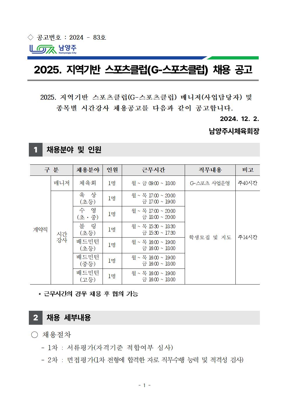 2025. 지역기반 스포츠클럽(G-스포츠클럽) 채용 공고 작성자 남양주시체육회 등록일자 2024년 12월 2일 10시 1분 48초 조회 459 채용서류일체 1부..hwp [ Size : 60KB, Down : 438 ] 다운로드 2025. 지역기반 스포츠클럽 공개채용 공고문 1부...pdf [ Size : 145.18KB, Down : 490 ] 다운로드 2025. 지역기반 스포츠클럽 공개채용 공고문.jpg [ Size : 129.64KB, Down : 602 ] 미리보기 다운로드 목록보기