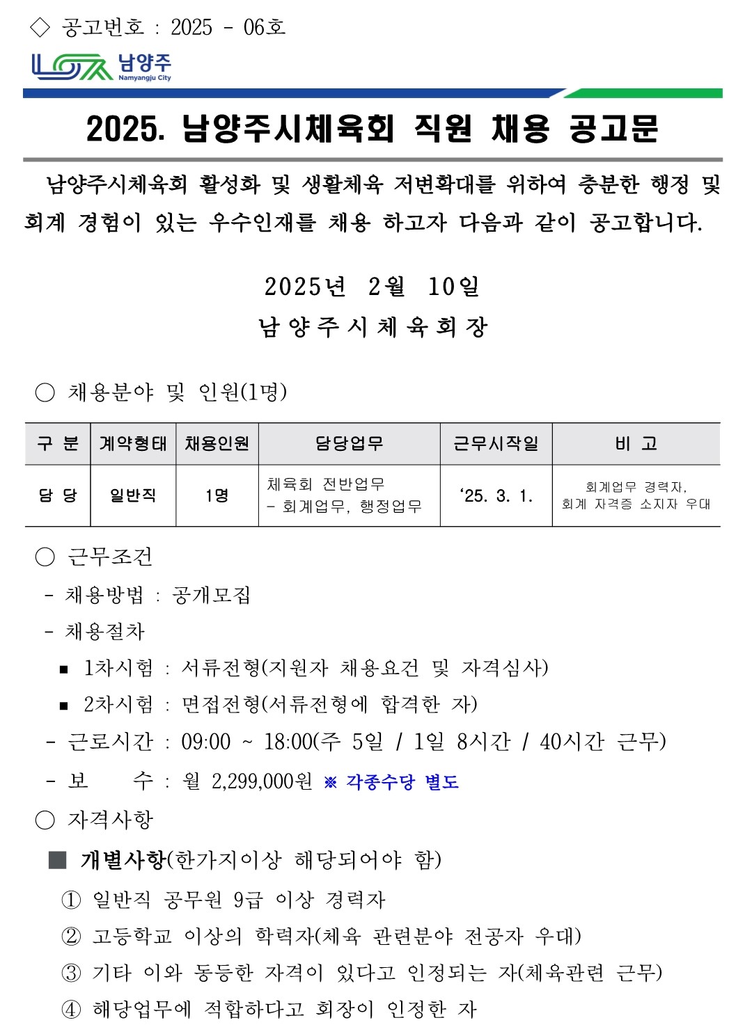 2025년 직원 채용 공고 작성자 남양주시체육회 등록일자 2025년 2월 10일 9시 56분 40초 조회 682 자세한 내용은 첨부파일을 확인해주시기 바랍니다. 2025년 직원 채용 공고문.pdf [ Size : 349.82KB, Down : 560 ] 다운로드 응시원서 양식.hwp [ Size : 59KB, Down : 337 ] 다운로드 2025년 직원 채용 공고문.jpg.jpg [ Size : 240.66KB, Down : 897 ] 미리보기 다운로드 목록보기